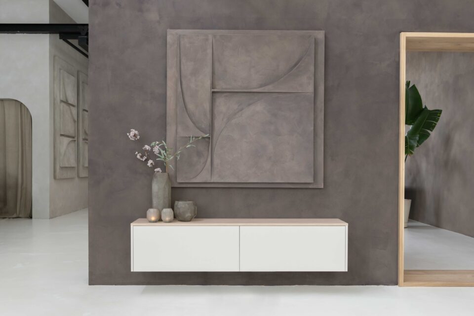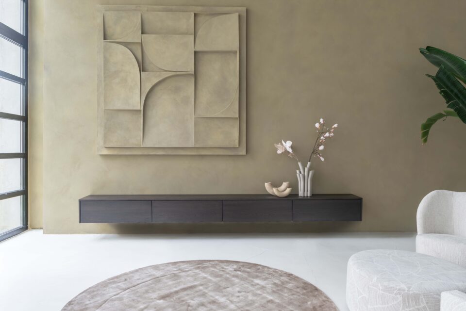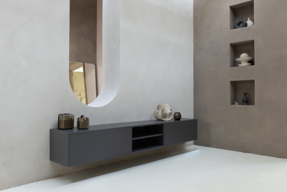 Het tv-meubel in deze foto is zwevend aan de muur gemonteerd, is door ons gespoten in Clay Hue en heeft een afmeting van 160 x 40 x 40 cm.