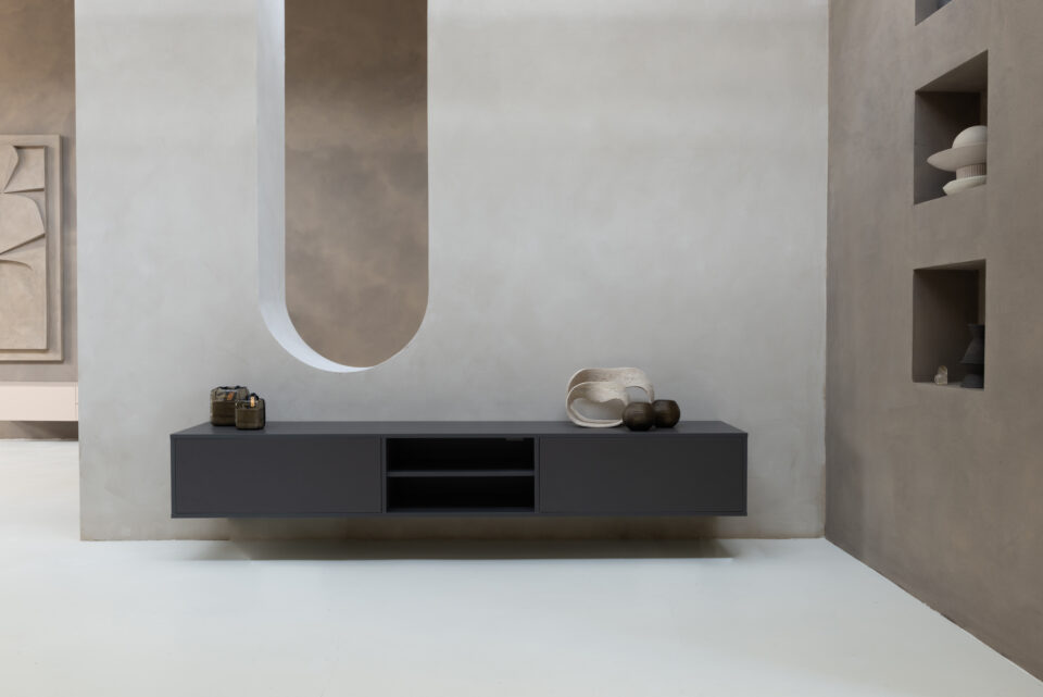 Het tv-meubel in deze foto is zwevend aan de muur gemonteerd, is door ons gespoten in RAL 9005 en heeft een afmeting van 280 x 40 x 46 cm.