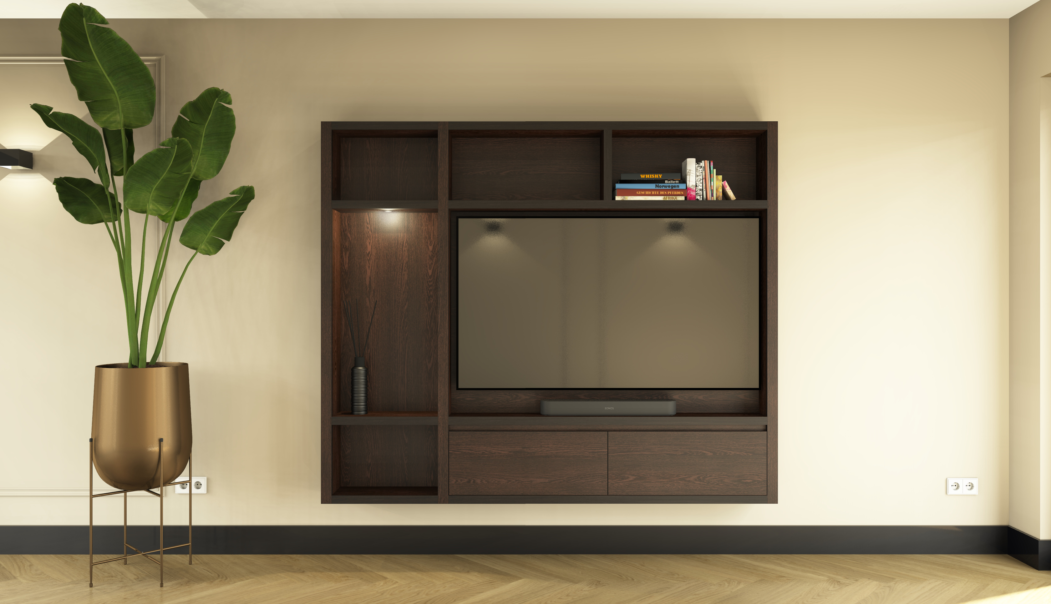 De James Cinewall is ontworpen om zwevend aan de muur te worden gemonteerd, wat niet alleen een eigentijdse uitstraling creëert, maar ook ruimte bespaart en een strakke, gestroomlijnde esthetiek bevordert. Met diverse configuratiemogelijkheden biedt de James Cinewall een aanpasbare oplossing die perfect aansluit bij jouw individuele behoeften en smaak.