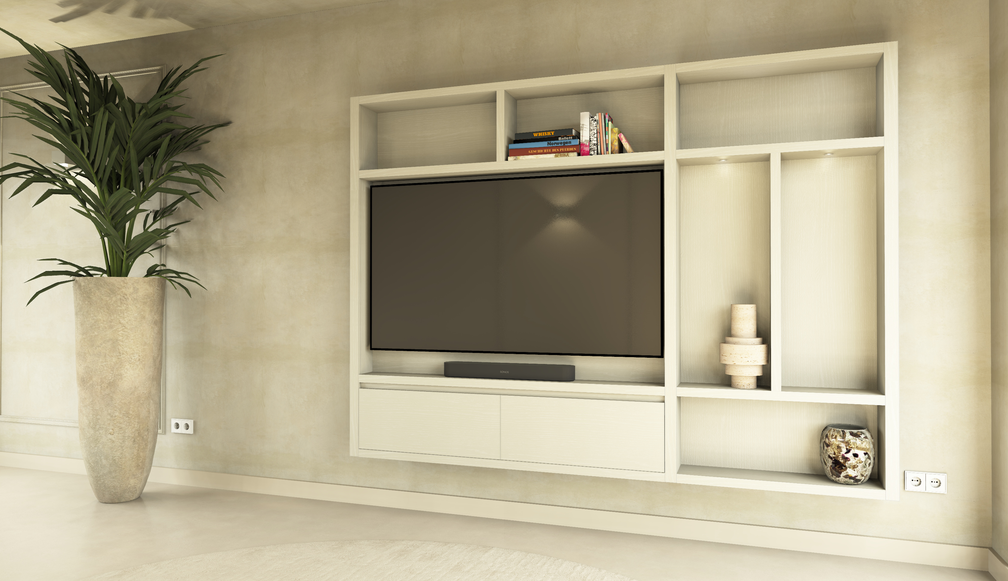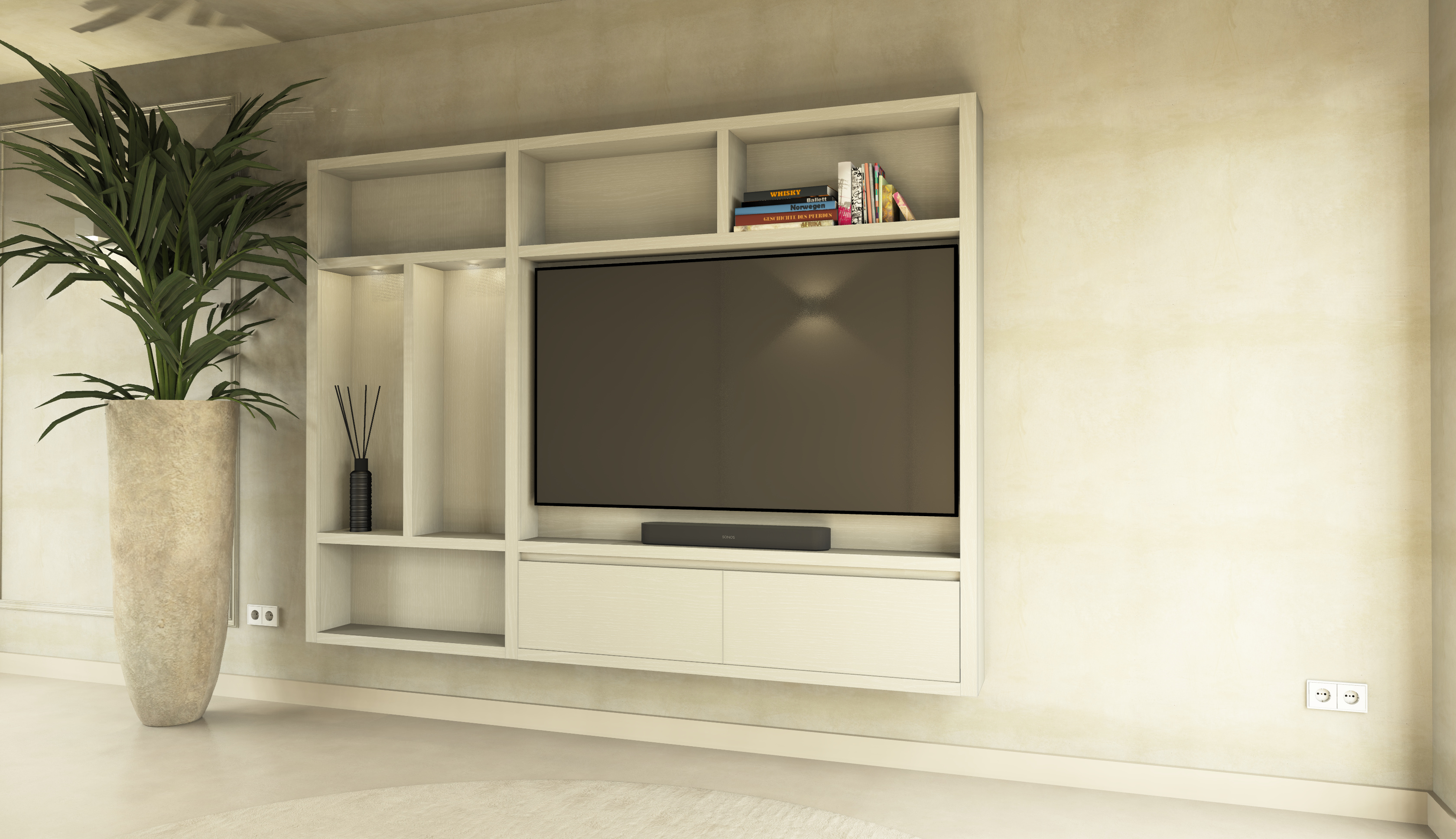 Dit op maat gemaakte cinewall systeem is verkrijgbaar in verschillende configuraties, zodat je de perfecte opstelling kunt kiezen die past bij jouw persoonlijke smaak en ruimtevereisten. James biedt een scala aan mogelijkheden om uw interieur aan te passen aan uw persoonlijke voorkeuren. Of u nu kiest voor een ingetogen look of een opvallende stijl met LED-verlichting in de bovenste plank van het middelste vak, James past zich aan uw wensen aan.
