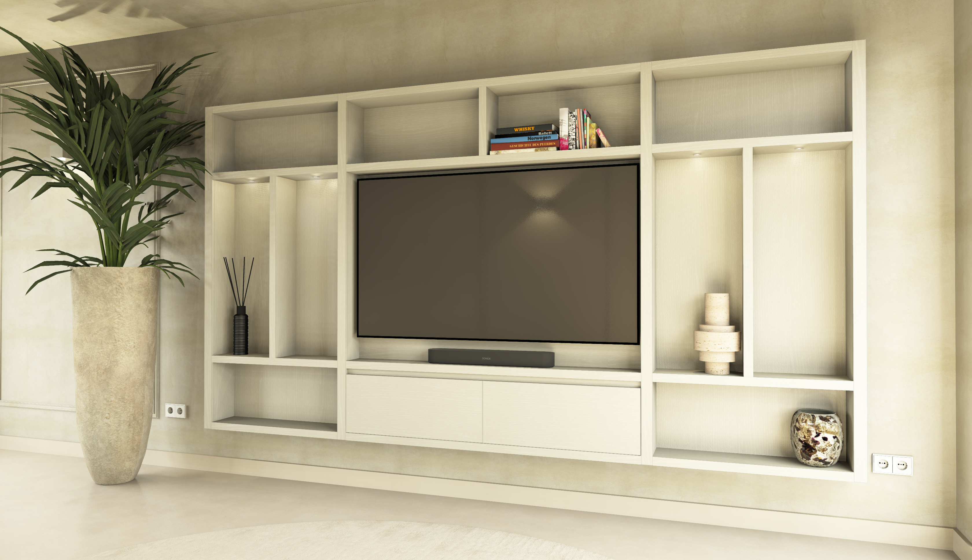 Dit op maat gemaakte cinewall systeem is verkrijgbaar in verschillende configuraties, zodat je de perfecte opstelling kunt kiezen die past bij jouw persoonlijke smaak en ruimtevereisten. James biedt een scala aan mogelijkheden om uw interieur aan te passen aan uw persoonlijke voorkeuren. Of u nu kiest voor een ingetogen look of een opvallende stijl met LED-verlichting in de bovenste plank van het middelste vak, James past zich aan uw wensen aan.