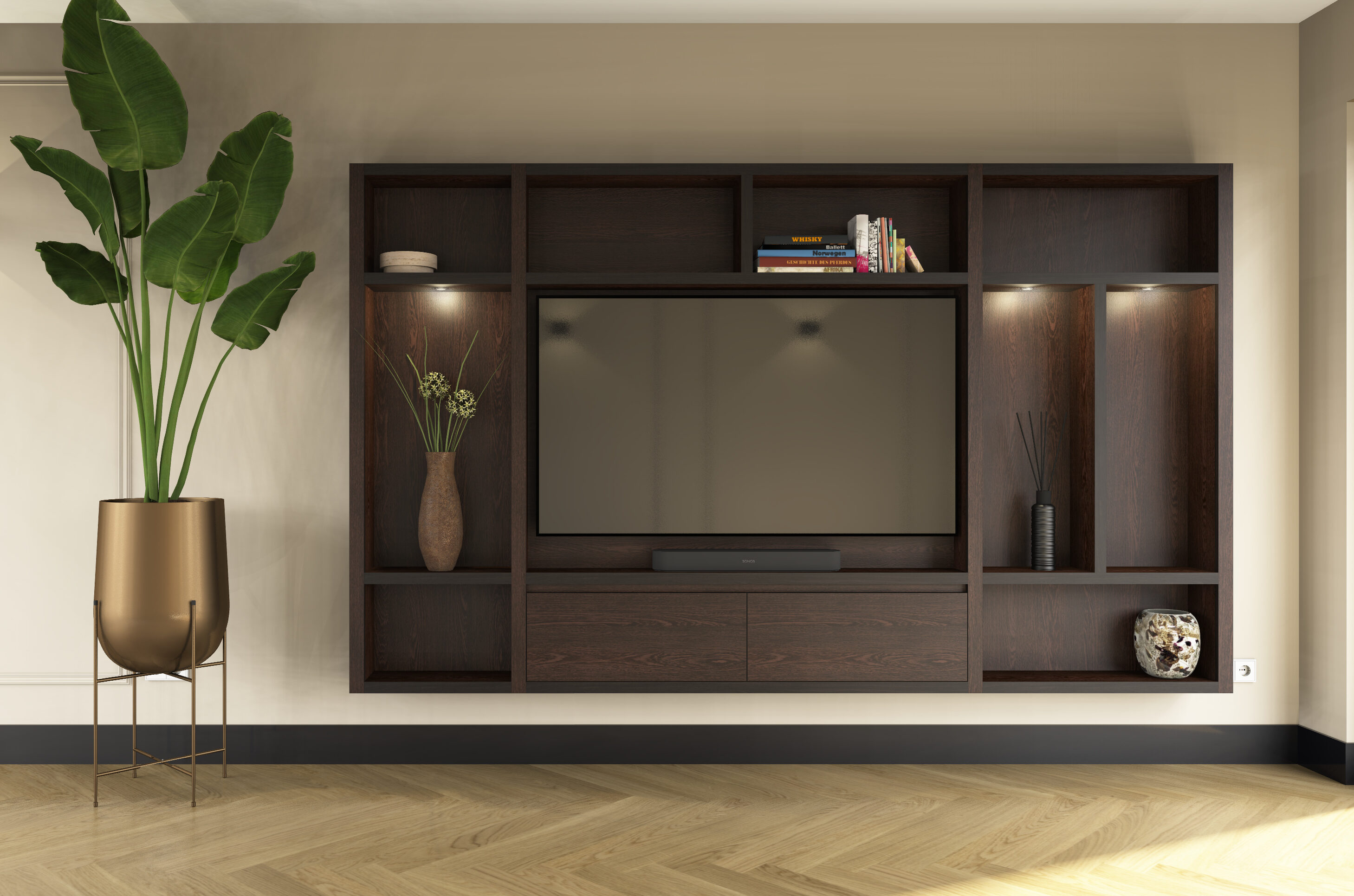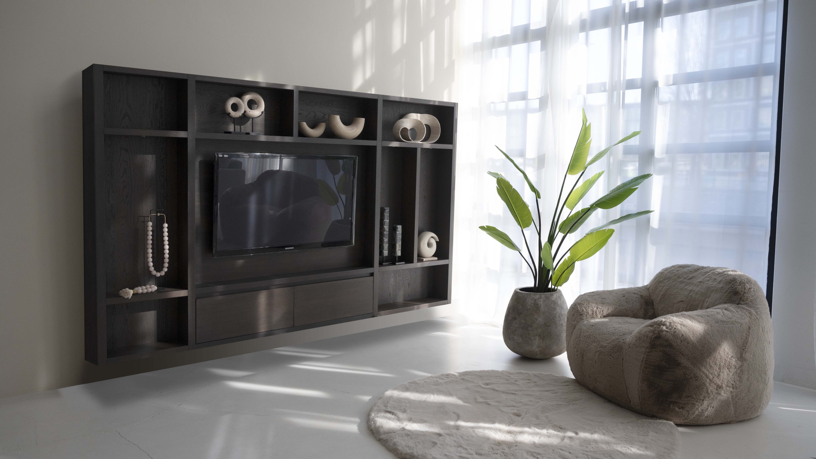 De James Cinewall is ontworpen om zwevend aan de muur te worden gemonteerd, wat niet alleen een eigentijdse uitstraling creëert, maar ook ruimte bespaart en een strakke, gestroomlijnde esthetiek bevordert. Met diverse configuratiemogelijkheden biedt de James Cinewall een aanpasbare oplossing die perfect aansluit bij jouw individuele behoeften en smaak.