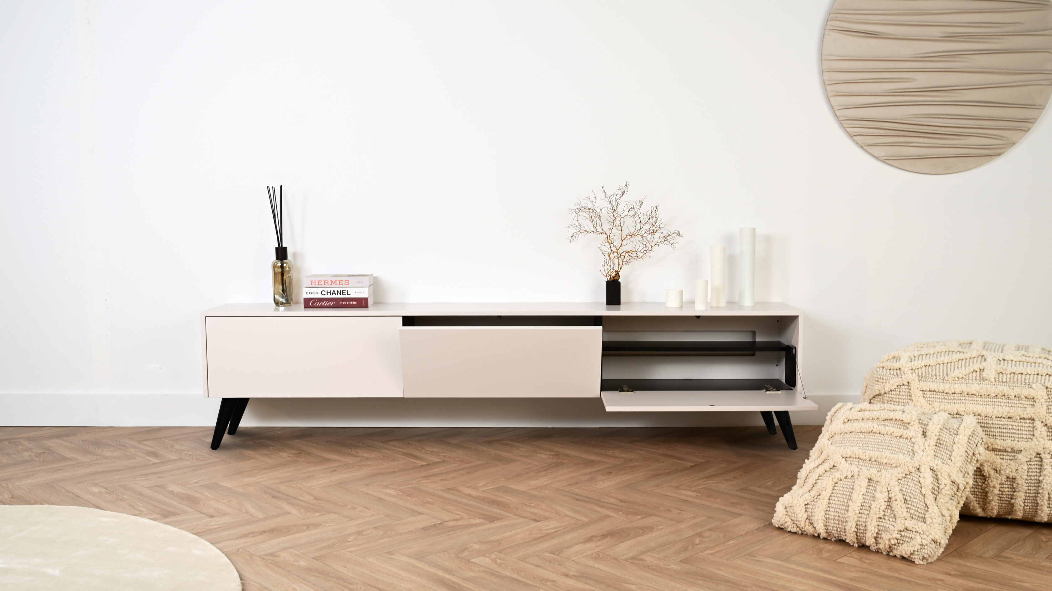 Bij Jessie draait alles om personalisatie. Ons tv-meubel is verkrijgbaar in verschillende kleuren, en wat Jessie echt uniek maakt, is dat we deze in onze eigen spuiterij voor je op maat kunnen maken. Of je nu kiest voor een tijdloze neutrale tint of een gedurfde kleuraccent, Jessie past zich aan jouw stijl aan.