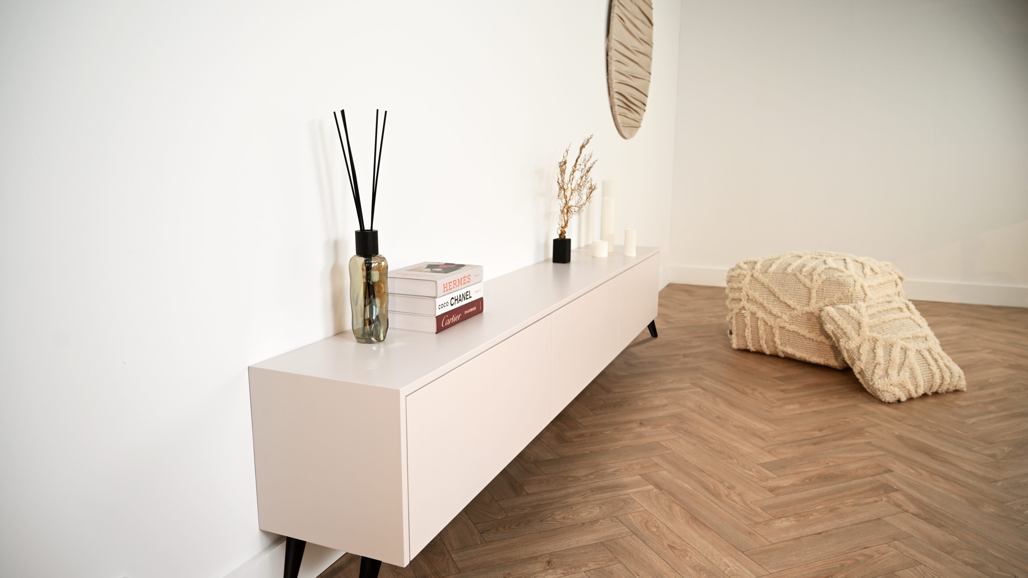Ervaar de perfecte mix van vintage flair en modern design met onze tv-meubels op stalen retro pootjes. Elk meubelstuk tot 300 cm kan worden geleverd met zorgvuldig vormgegeven stalen pootjes.