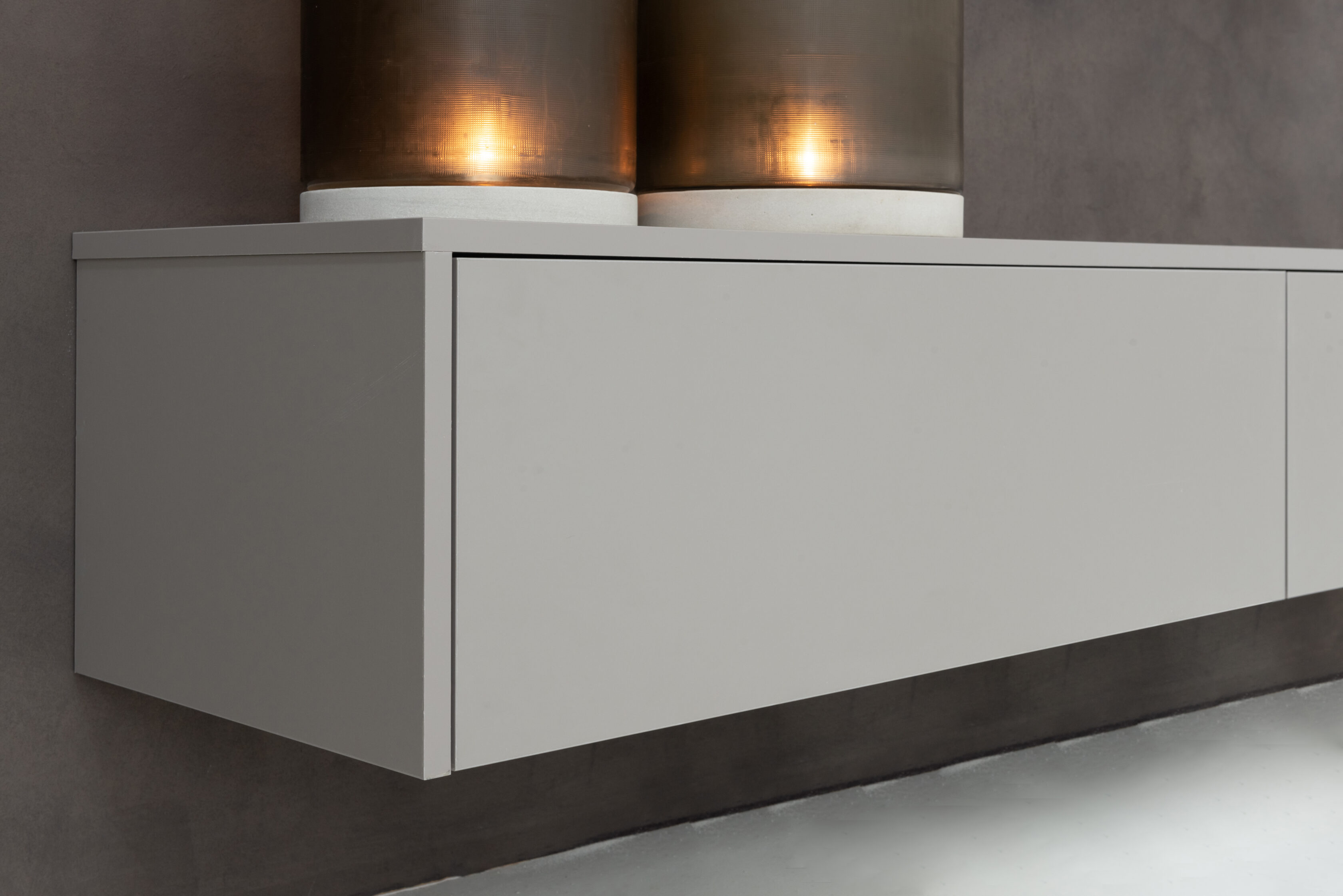 Het tv-meubel in deze foto is zwevend aan de muur gemonteerd, is van melamine en heeft een afmeting van 180 x 40 x 30 cm.